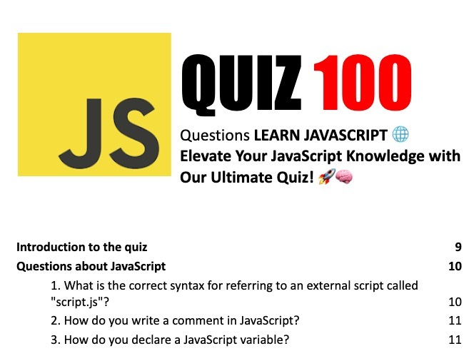 Introduction to the Quiz: The eBook kicks off with an engaging introduction that sets the stage for what's to come. It outlines the structure and approach of the 100 questions, designed to build from basic to more complex concepts, ensuring a thorough understanding of JavaScript's core principles.